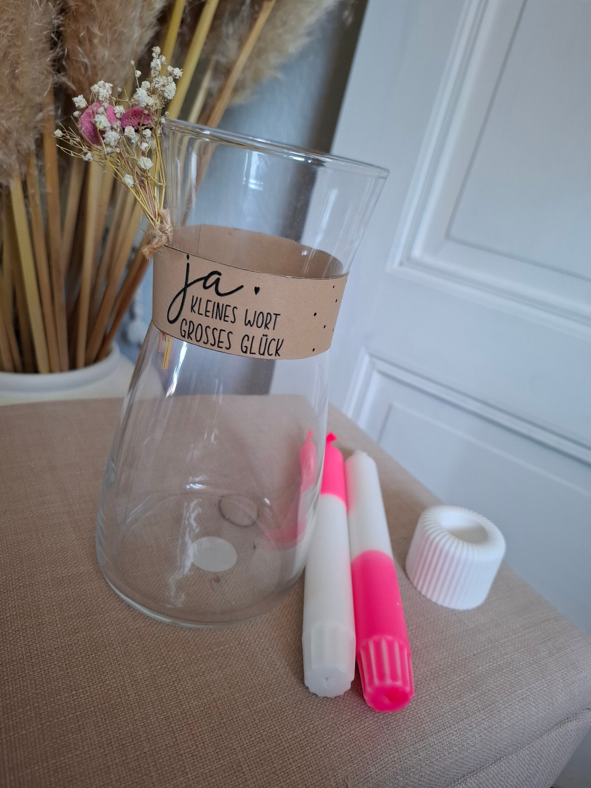 - Glasvase hübsch dekoriert mit Banderole
