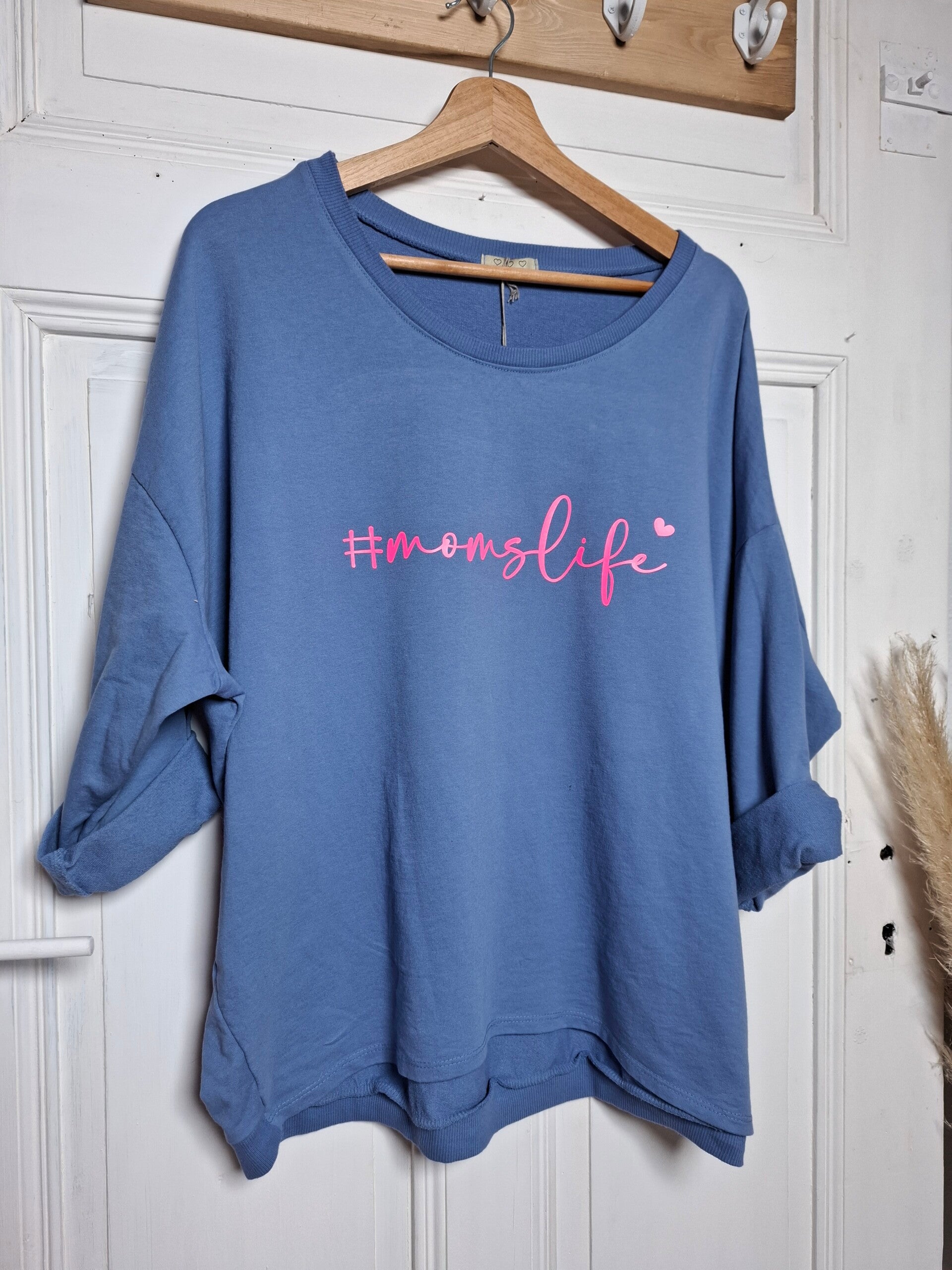 Der dezente Schriftzug „#momslife“ in Pink wird von mir mit viel Liebe von Hand veredelt und macht jedes Teil zu etwas Besonderem. Der weiche Baumwollstoff sorgt für ein angenehmes Tragegefühl, der lockere Schnitt für maximale Bewegungsfreiheit.