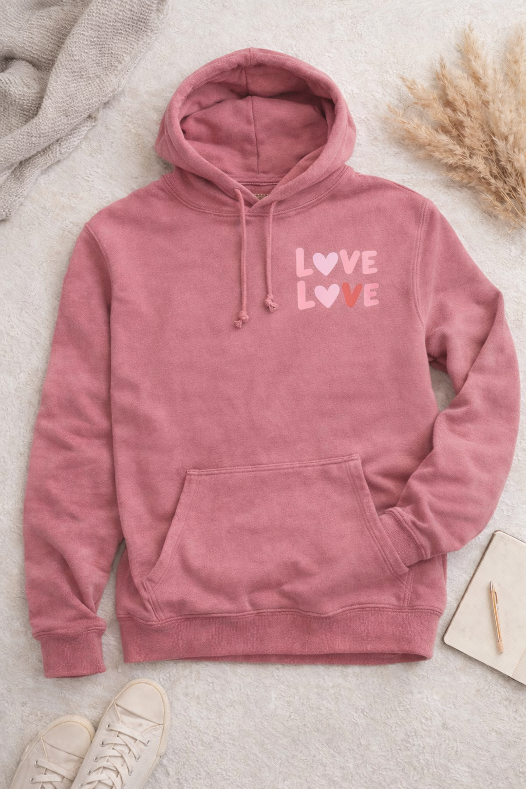 Der Hoodie „LOVE LOVE“ ist mehr als nur bequem – er steht für Wärme, Liebe und ein gutes Gefühl im Alltag.
