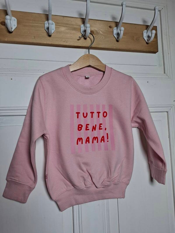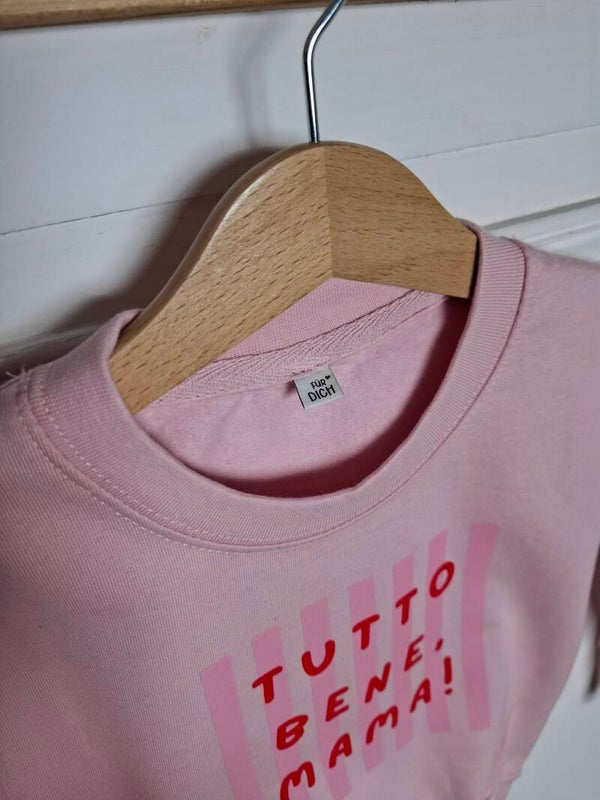 Der zarte Rosaton kombiniert mit dem Statement „Tutto bene, Mama!“ verleiht dem Sweater eine emotionale und besondere Bedeutung. Perfekt für kleine Lieblingsmenschen und als Geschenk mit Herz.