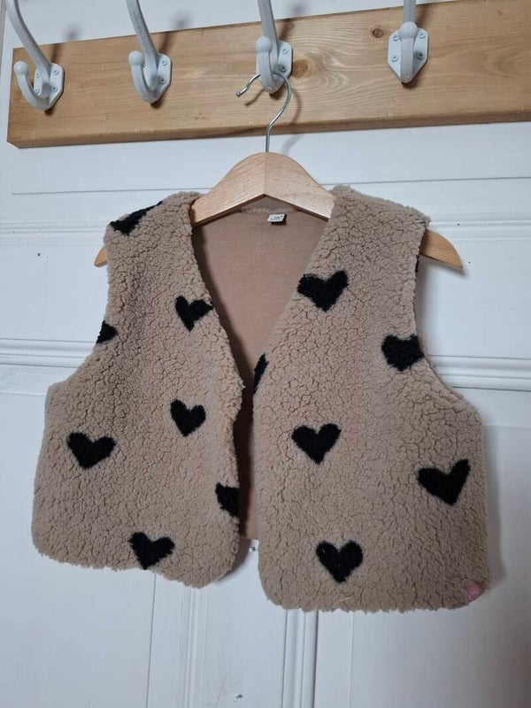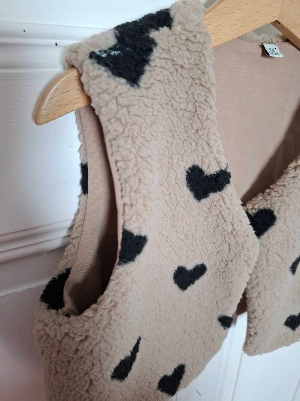 Diese handgenähte Teddyweste mit süßem Herzmuster ist ein ganz besonderes Einzelstück und wurde mit viel Liebe zum Detail gefertigt. Der weiche Teddyplüsch sorgt für ein angenehmes, warmes Tragegefühl und macht die Weste zum perfekten Begleiter für kühlere Tage.